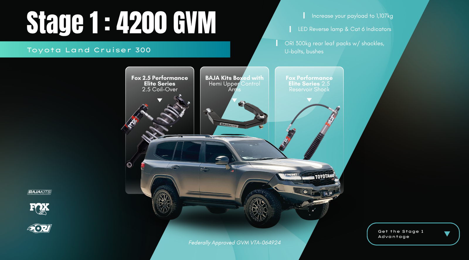 Own a Toyota Landcruiser LC300 and need a GVM upgrade? We've secured federal approval for 4200 GVM packages featuring Fox suspension options. Choose the Stage 1 upgrade with Fox 2.5 Performance Elite Suspension or go for the Stage 2 with Fox 3.0 Factory Race Suspension.