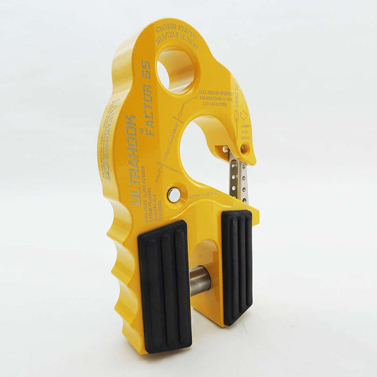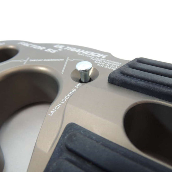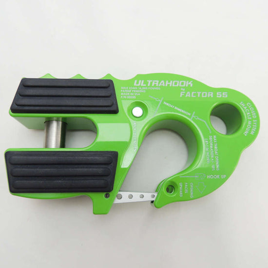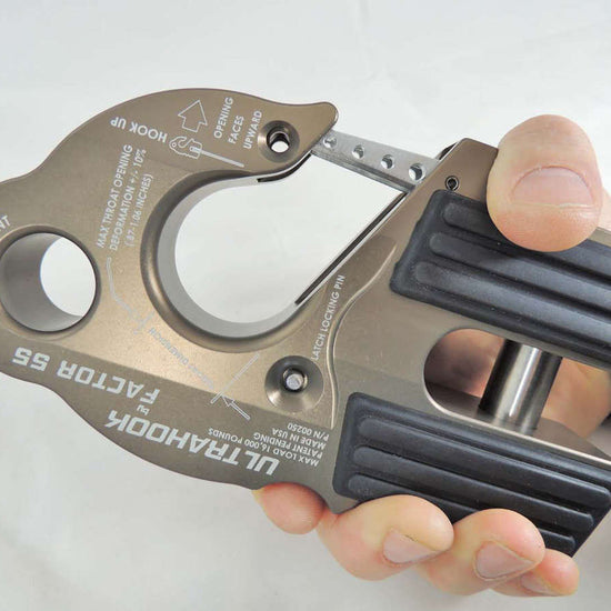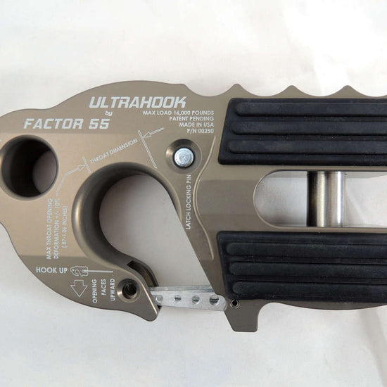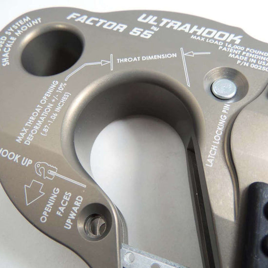 Featuring Industry first Closed System Shackle Mount hole machined into the body of the hook, safety latch retraction pocket resulting in a clear throat opening, integrated secondary safety latch locking feature-latch locking pin stored in the body of the UltraHook which can be removed and inserted in to the hook tip, locking the latch into place.